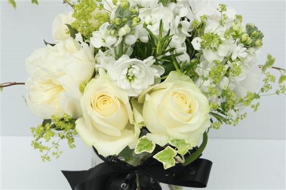 A dainty vintage style display of white and cream summer stems including stocks and roses.